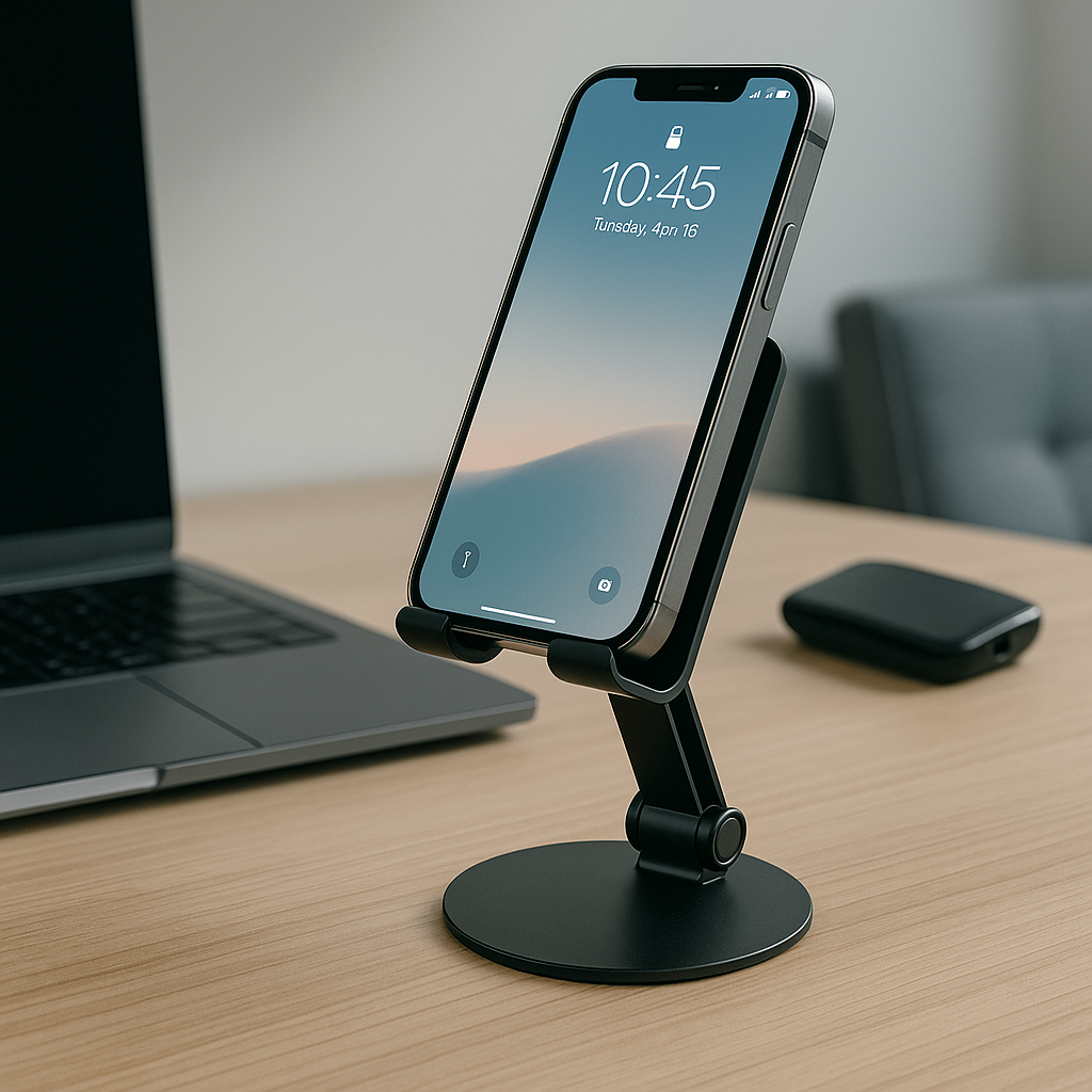 Ideal para tu escritorio, oficina o mesita de noche —su base antideslizante y su eje giratorio de 360° te permiten disfrutar de videollamadas, series o trabajo con total comodidad.